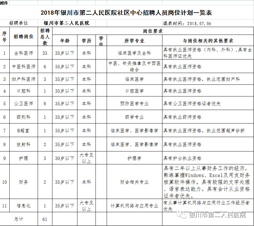 除上述條件外,報考者必須符合《2018年銀川市第二人民醫(yī)院社區(qū)中心招聘人員崗位計劃一覽表》所規(guī)定的其他崗位設(shè)置的要求。