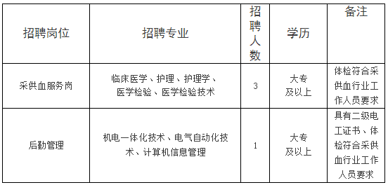 因業(yè)務(wù)發(fā)展需要,嘉興市中心血站決定公開招聘編外合同制人員4名,現(xiàn)將公開招聘有關(guān)事項(xiàng)公告如下: