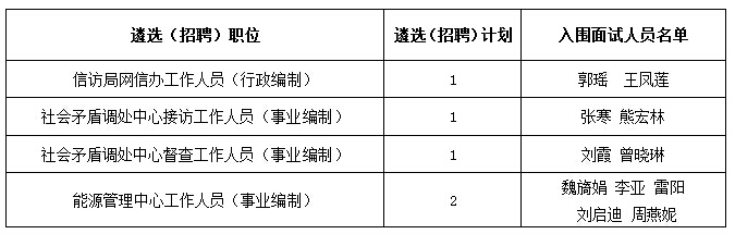 公開遴選(招聘)工作人員筆試工作已結(jié)束,根據(jù)筆試成績及遴選(招聘)筆試公告(每個職位以筆試成績從到低分,按照1:2的比例確定面試入圍人員,筆試成績相同的,均進(jìn)入面試),現(xiàn)將入圍面試人員名單及相關(guān)事項(xiàng)公示如下: