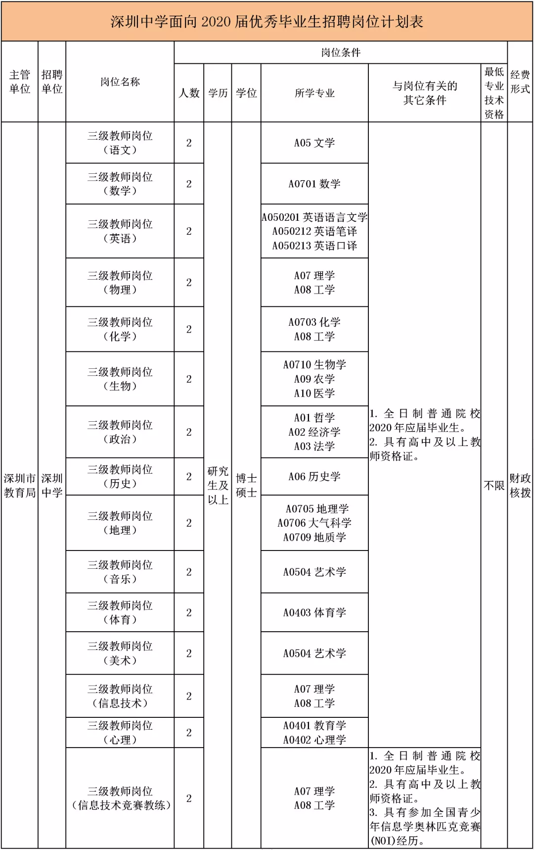 2019年9月廣東深圳中學(xué)面向2020屆畢業(yè)生赴外定點(diǎn)(校招)招聘教師30人公告
