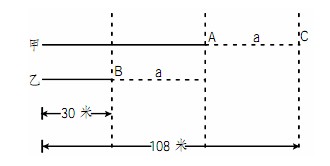 如圖所示,在K時刻,甲和乙分別在A、B兩點,且相隔距離為a,他們繼續(xù)前進,由題意乙從B點前進到A點,同時甲從A點前進到C點,兩人以相同的速度勻速前進,那么A、C兩點之間的距離也為a,則a=(108-30)÷2=39米,即甲、乙之間的距離為39米,故此時乙離起點30+39=69米。