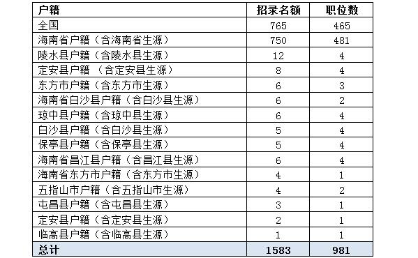 本次考試半數(shù)以上的職位對(duì)考生的戶籍進(jìn)行了設(shè)定,818個(gè)名額、516個(gè)職位需為海南省內(nèi)戶籍(含海南省生源),而且部分職位具體到某個(gè)縣,占到總計(jì)劃名額的52.6%,此外,也有765個(gè)名額、465個(gè)職位不限制戶籍,全國(guó)人民都有機(jī)會(huì)在海南實(shí)現(xiàn)自己的成“公”夢(mèng)想。