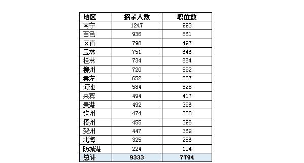 本次考試招錄計(jì)劃覆蓋廣西各個(gè)地(市),其中首府南寧一1247人、993個(gè)職位在招錄榜單上居于首位,百色地區(qū)以936人、861個(gè)職位緊隨其后,區(qū)直機(jī)關(guān)招錄規(guī)模也不可小覷,招錄798人、497個(gè)職位,對(duì)于向往直接進(jìn)行區(qū)直機(jī)關(guān)工作的考生來說是一利好消息。
