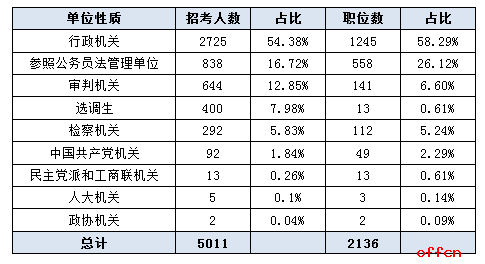 本次招錄計劃覆蓋了黨、政、法等各類系統(tǒng),行政機關(guān)招錄2725人、占總?cè)藬?shù)的54.38%,招錄1245個職位,占總職位數(shù)的58.29%,接近六成,與去年相比,占比有小幅下降;其次是參照公務(wù)員法管理單位,職位占比26.12%,與去年相比也略有下滑,這也與總?cè)藬?shù)下降有一定關(guān)聯(lián)。