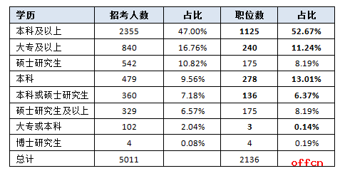 從上表可以看出,京考的學(xué)歷門檻并不高,本科學(xué)歷仍然是本次招錄的主體,1782個職位本科生可以報考,占總職位數(shù)的77.02%,大專學(xué)歷可報的職位也有243個,比去年高出14個,占到總職位數(shù)的11.38%,僅有4個職位要求博士研究生,而去年僅有1個職位要求博士學(xué)位,這說明京考對高學(xué)歷人才的需求日益增加,這4個職位來自北京市地方稅務(wù)局、北京市質(zhì)量技術(shù)監(jiān)督局、北京奧林匹克公園管委會,要求財政學(xué)、經(jīng)濟學(xué)、法學(xué)等相關(guān)專業(yè),符合條件的博士生可以重點考慮一下。