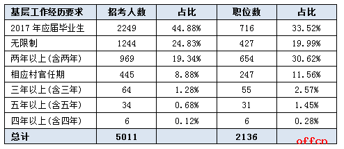 本次招錄中明確要求只有2017年應(yīng)屆畢業(yè)生可以報考的職位有716個,不限制基層工作經(jīng)歷的職位有427個,這些職位應(yīng)屆生均可報考,占總職位數(shù)的53.51%,要求兩年基層工作經(jīng)歷的職位有654個,占總職位數(shù)的30.62%,大學(xué)生村官需計算一下自己的任期是否已滿,某些定向招錄大學(xué)生村官的職位還需具備一定的專業(yè)技能,比如北京市西城區(qū)人民法院綜合行政部門的一個職位除了要求考生是2017年北京地區(qū)服務(wù)期滿的大學(xué)生村官外,還必須取得會計從業(yè)資格證書,因此,選職位時考生一定要仔細(xì)。