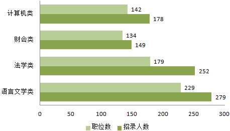 本次考試共有887個(gè)職位不限制專業(yè),占到總職位數(shù)的一半左右,說明報(bào)考條件正在放寬。語言類、法學(xué)類、財(cái)會類、計(jì)算機(jī)類是本次考試招錄的四大熱門專業(yè),其中語言文學(xué)類專業(yè)以279人、229個(gè)職位領(lǐng)先,成為本次招錄的“人氣”專業(yè)。