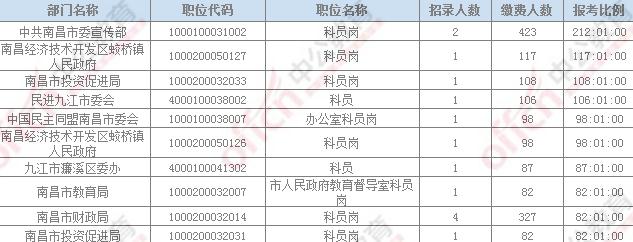 從今天的職位報名情況來看,報名人數(shù)最多的職位依然是“中共南昌市委宣傳部”,目前已經(jīng)繳費(fèi)423人,該職位計劃招考2人,報考比例212:1。該職位也是目前競爭最激烈的職位。