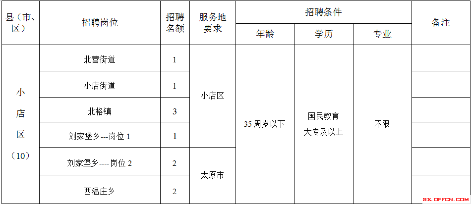 太原小店區(qū)公開(kāi)招聘鄉(xiāng)鎮(zhèn)(街道)事業(yè)單位工作人員崗位一覽表