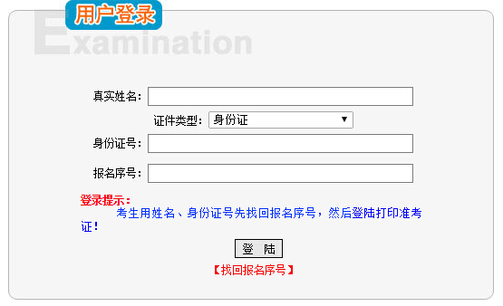 二、考生用姓名、身份證號(hào)先找回報(bào)名序號(hào),然后登陸準(zhǔn)考證打印系統(tǒng)。