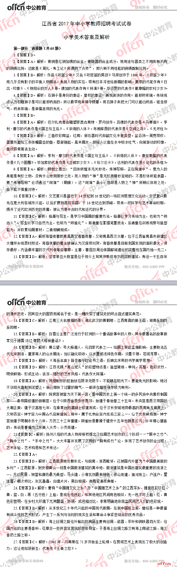 2017年江西教師招聘《小學(xué)美術(shù)》試題答案及解析