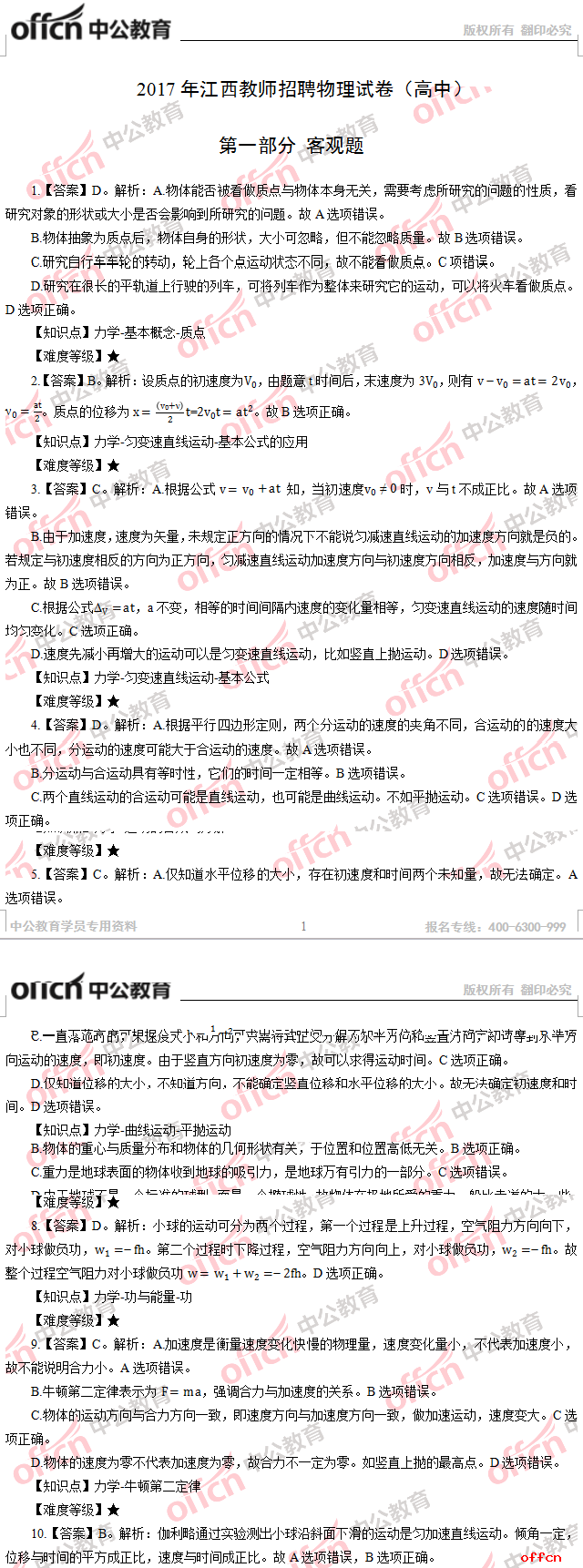2017年江西教師招聘《高中物理》試題答案及解析
